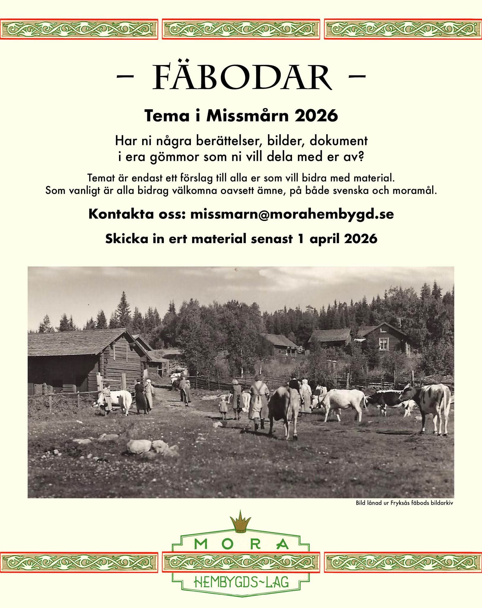 Missmårn kommer att handla om fäbodar 2026. Bidra gärna med exempel! Ge dessutom gärna ett exemplar av 2025 års utgåva i julklapp till någon vars hjärta brinner för hembygden!